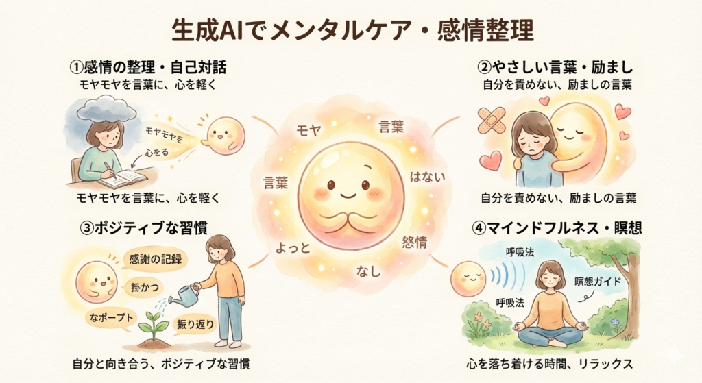 そんなとき、生成AIは「静かに話を聞いてくれる存在」として、感情を言語化したり、前向きな気持ちに切り替えるサポートをしてくれます。