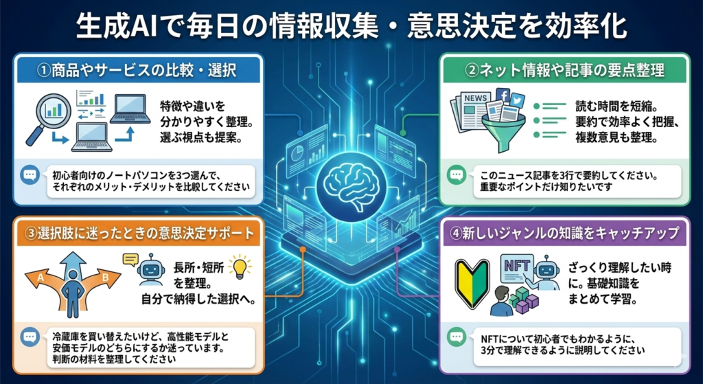 生成AIは、膨大な情報を自分に合った形で整理・要約し、選択や判断をサポートするパートナーとして活用できます。
