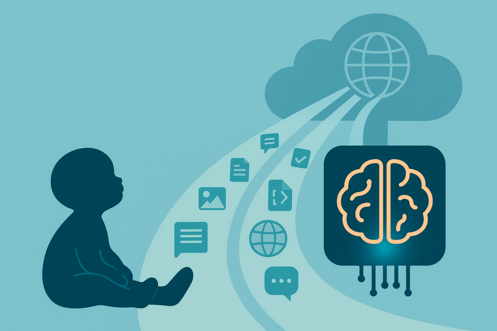 例えるなら、生まれたばかりの赤ちゃんが、私たちが話す言葉や身の回りにあるものを見て、聞いて、触れて、少しずつ知識を吸収していくのと同じです。生成AIは、それを人間の一生では到底不可能な、超高速かつ超大規模なスケールで行っていると考えてください。