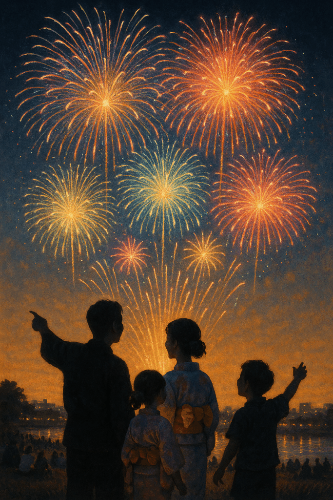 あなたは〇〇区の広報担当者です。『〇〇区民花火大会』のポスターメインビジュアルに使用するイメージ画像を生成してください。多摩川の河川敷から打ち上がる色鮮やかな花火と、それを見上げる楽しそうな家族のシルエットを描いてください。温かく、夏の夜の祭りの賑やかさを感じる雰囲気で、写実的かつ幻想的なタッチでお願いします。